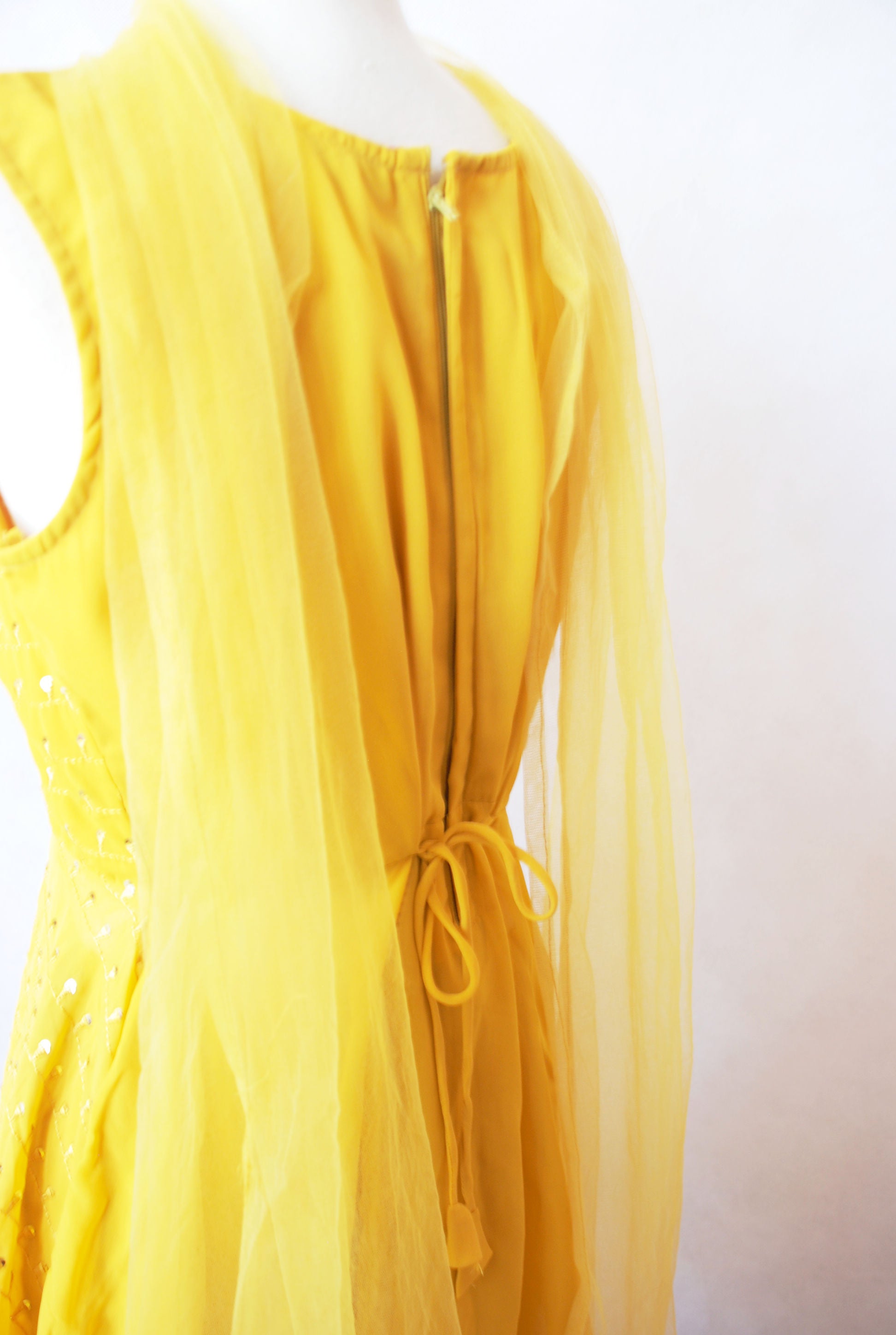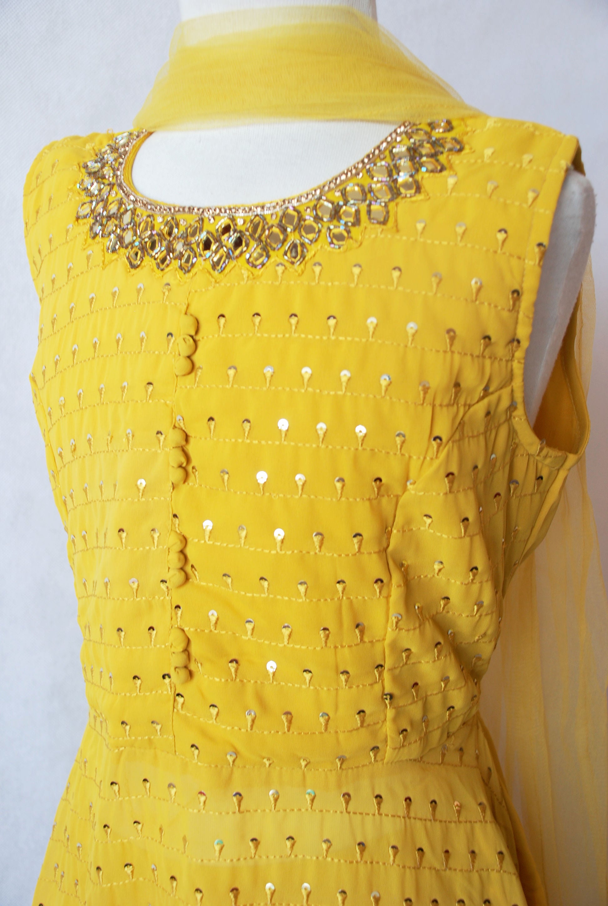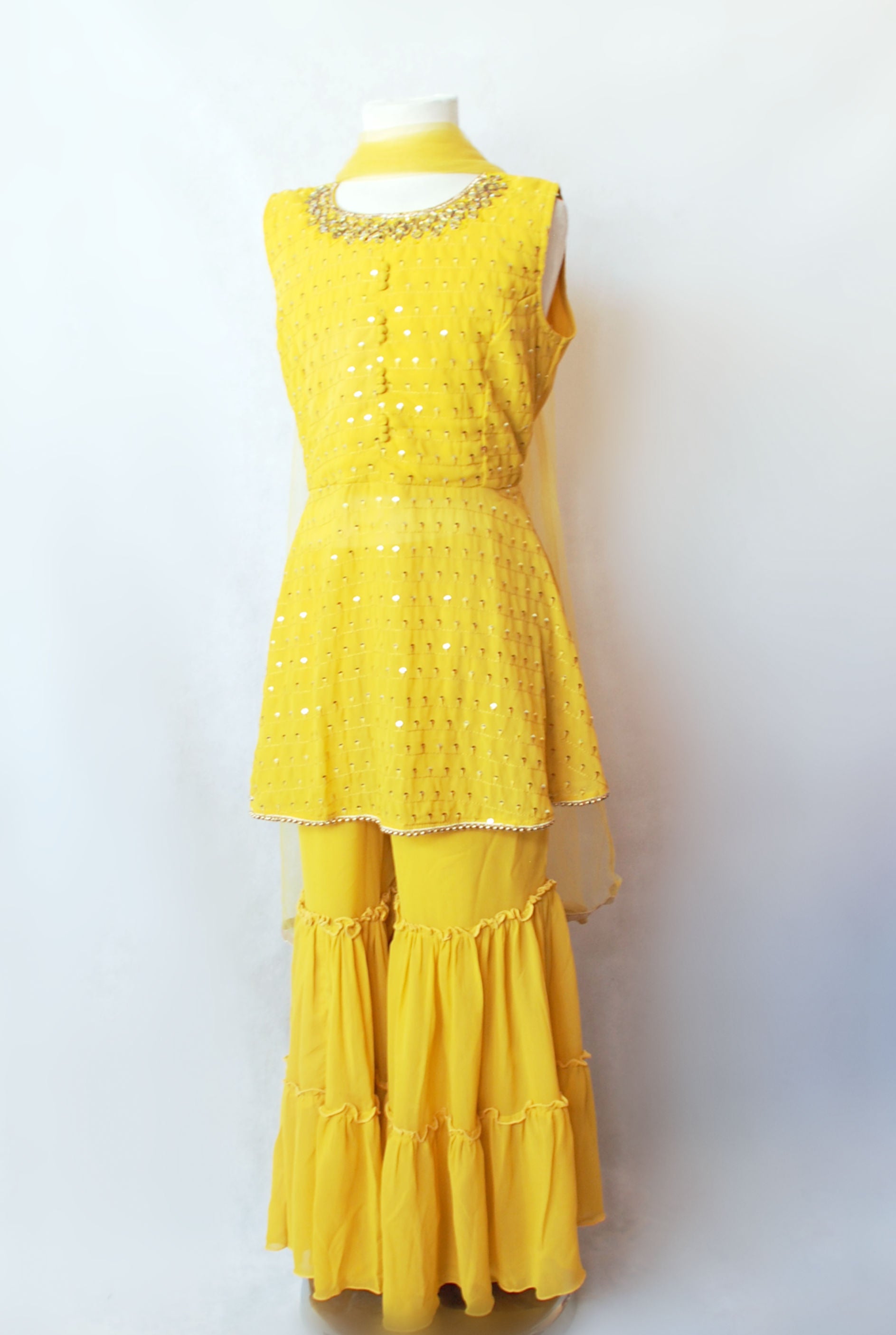 Mid-length, georgette, sleeveless kameez with a zip on the back and tie back at waist. Matching floaty, georgette, yellow gharara (very flared trouser) with a flat band and elasticated at the back. Dupatta in yellow net.