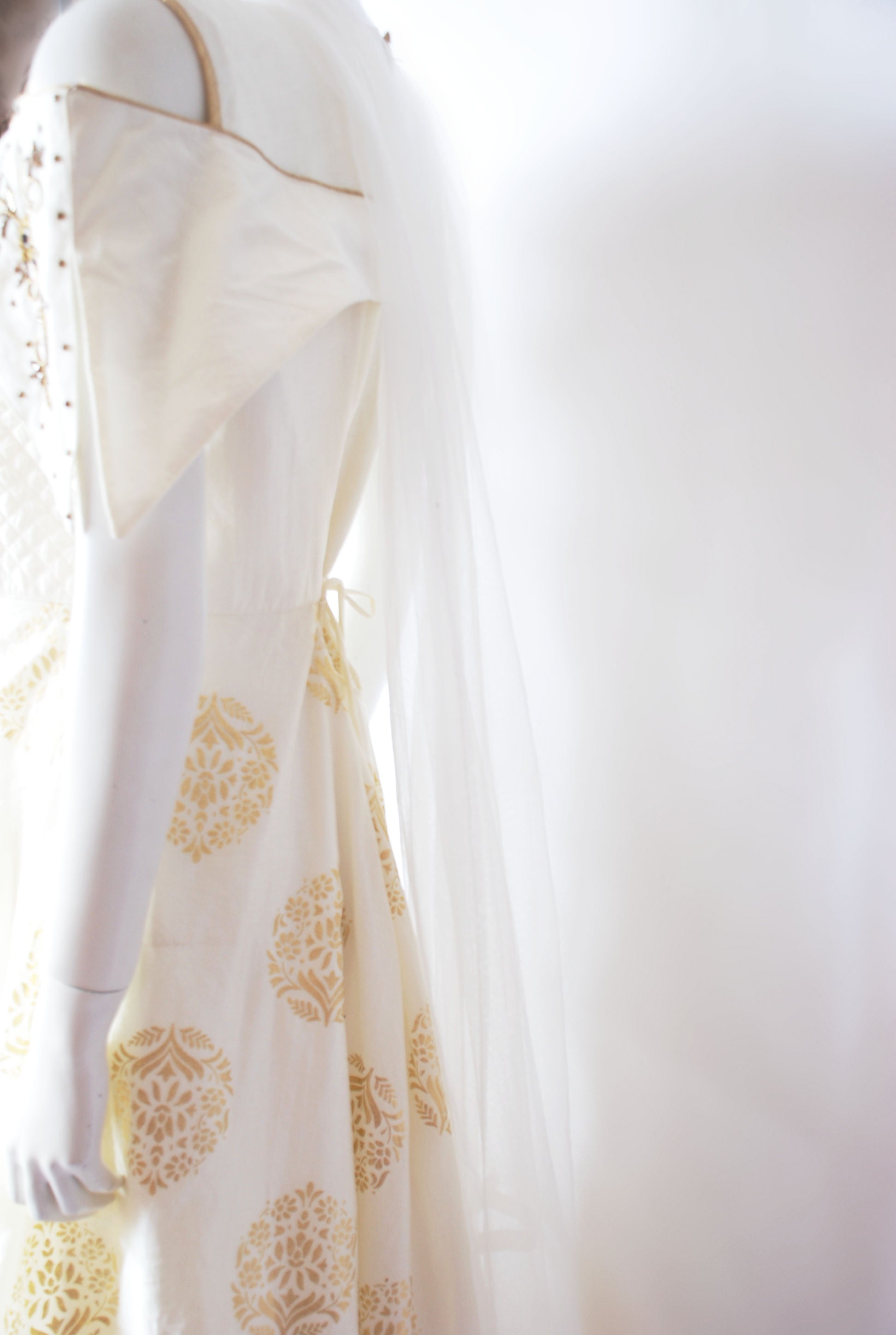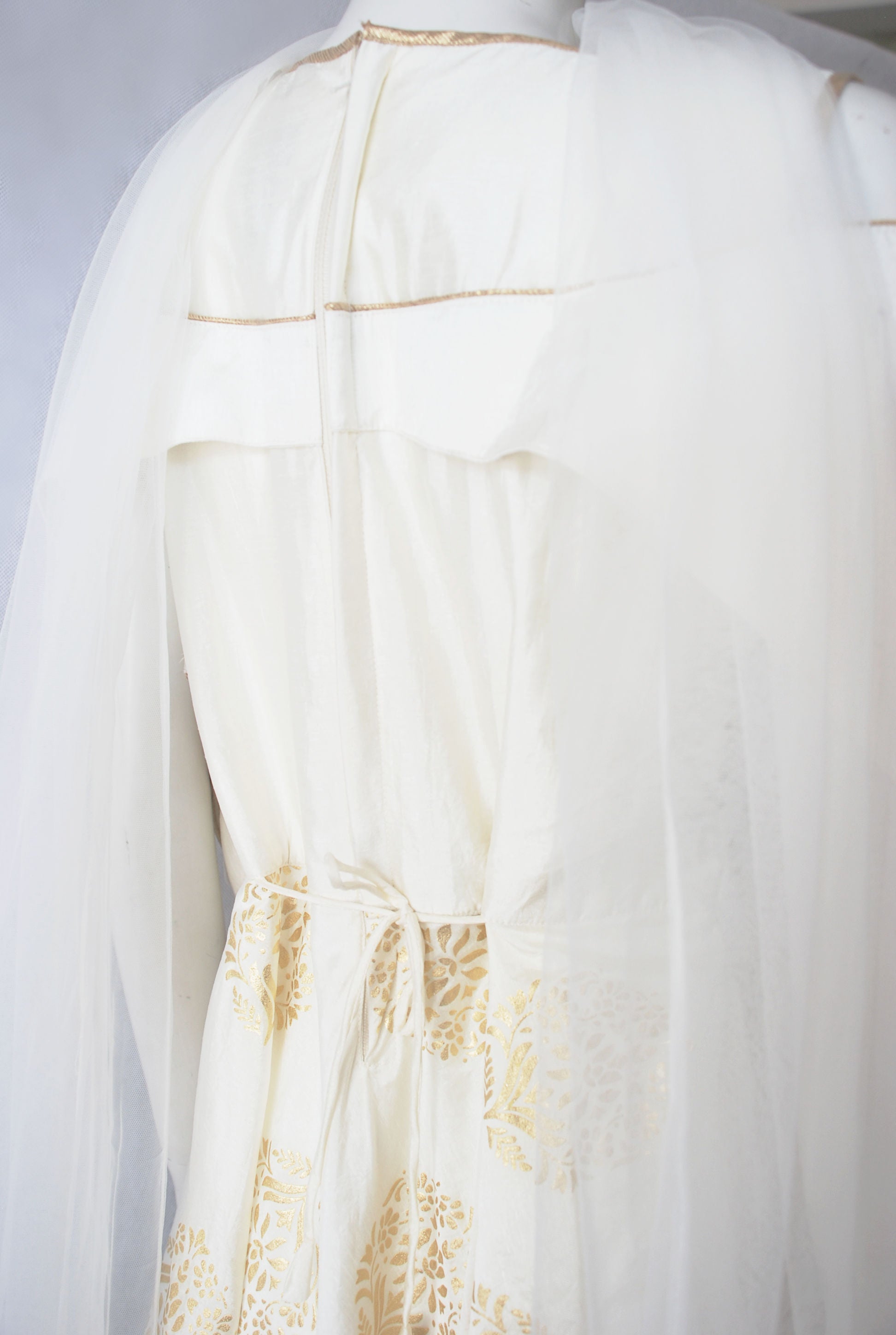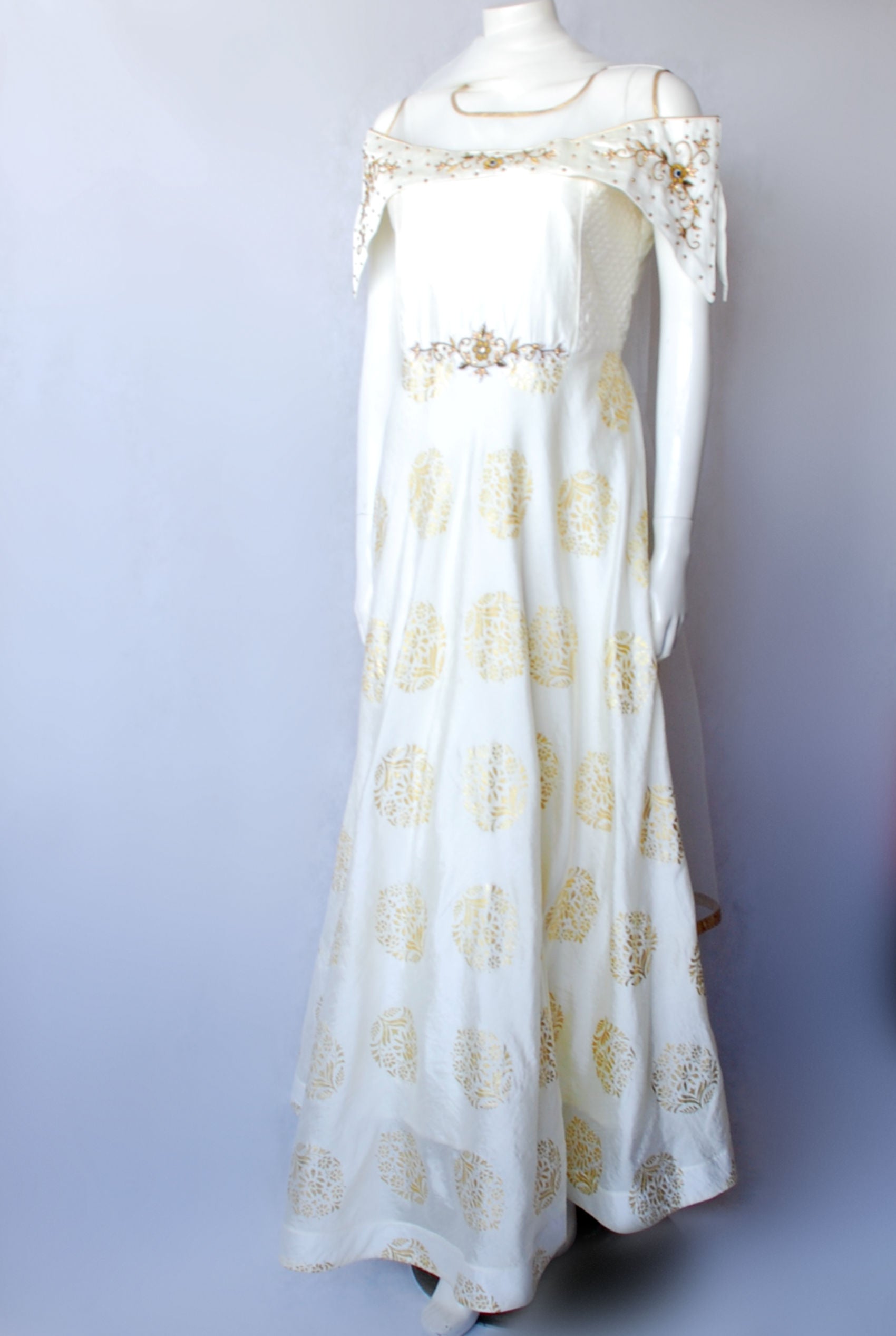 Ivory Cream and Gold Block Print Floor length SilkGown for Teen Girls. There is an antique gold bead and stone embroidery on the sleeve and front centre waist. The lower part is block print on silk. The shoulders and chest have a net illusion neckline.It also comes with elasticated churidar trousers (optional to wear underneath) as well as a net scarf (dupatta).
