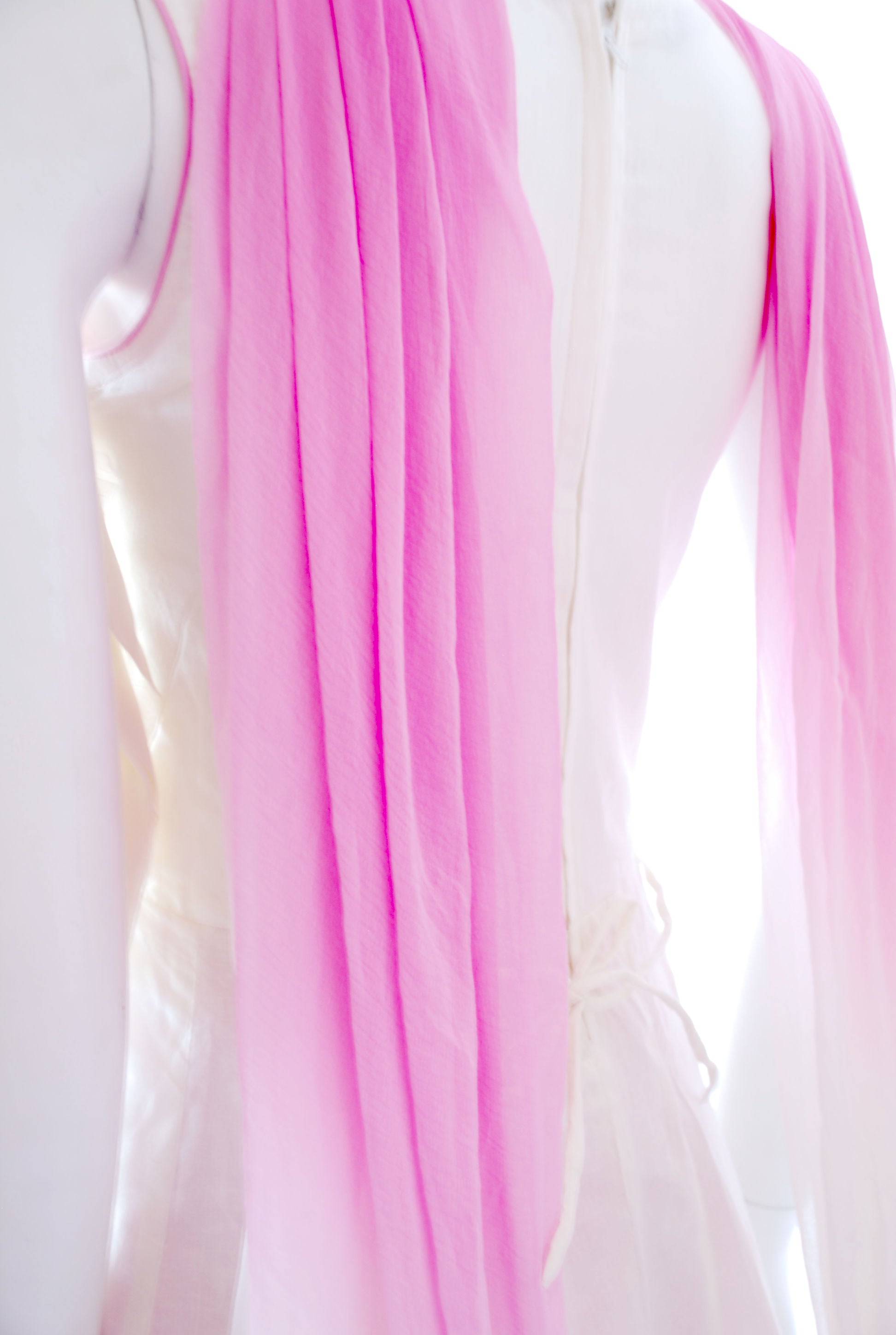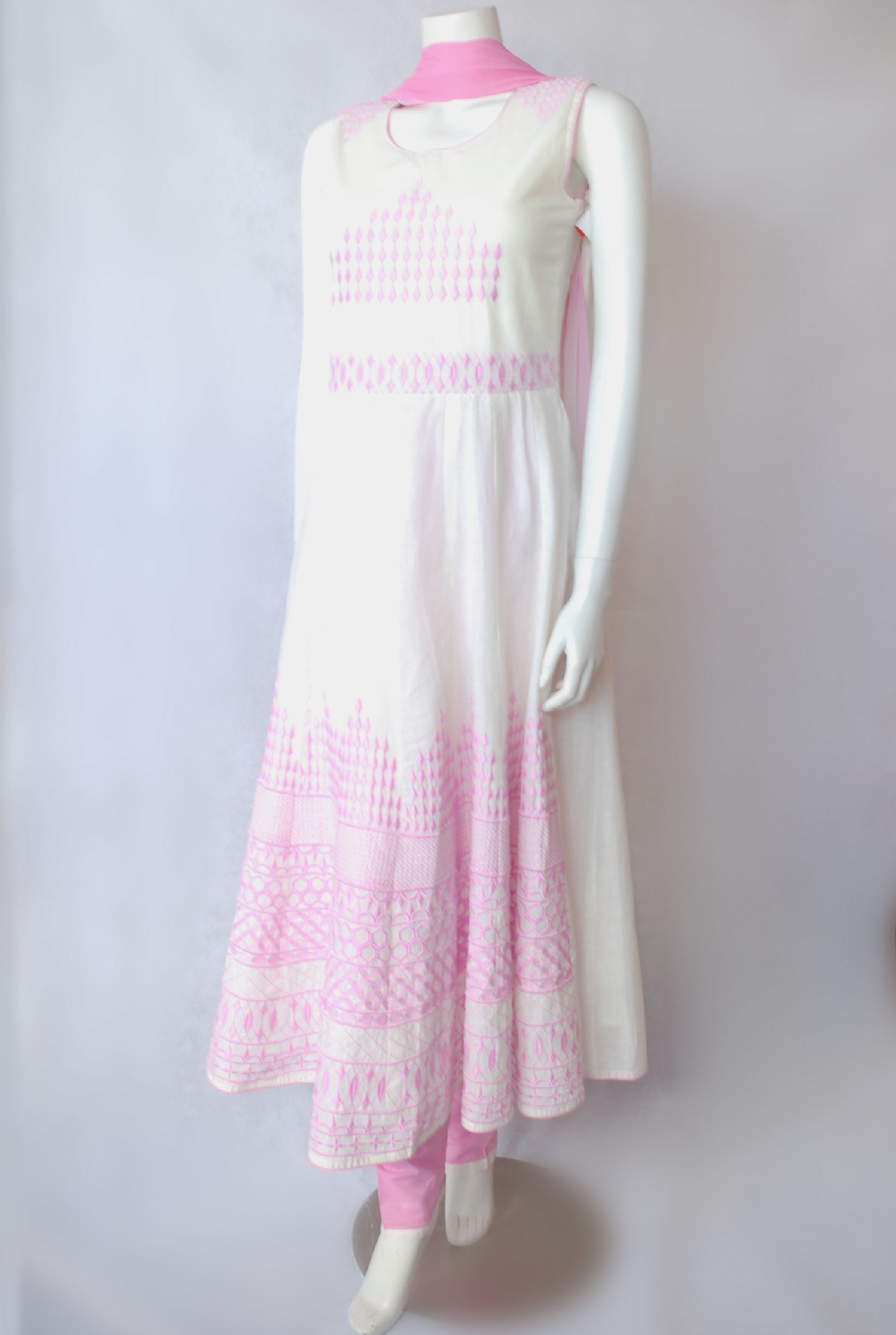 Slim fit - white cotton panelled anarkali with pink thread embroidery on bodice and lower part of the dress. Pink elasticated cotton churidar and an ombre pink & white chiffon dupatta.